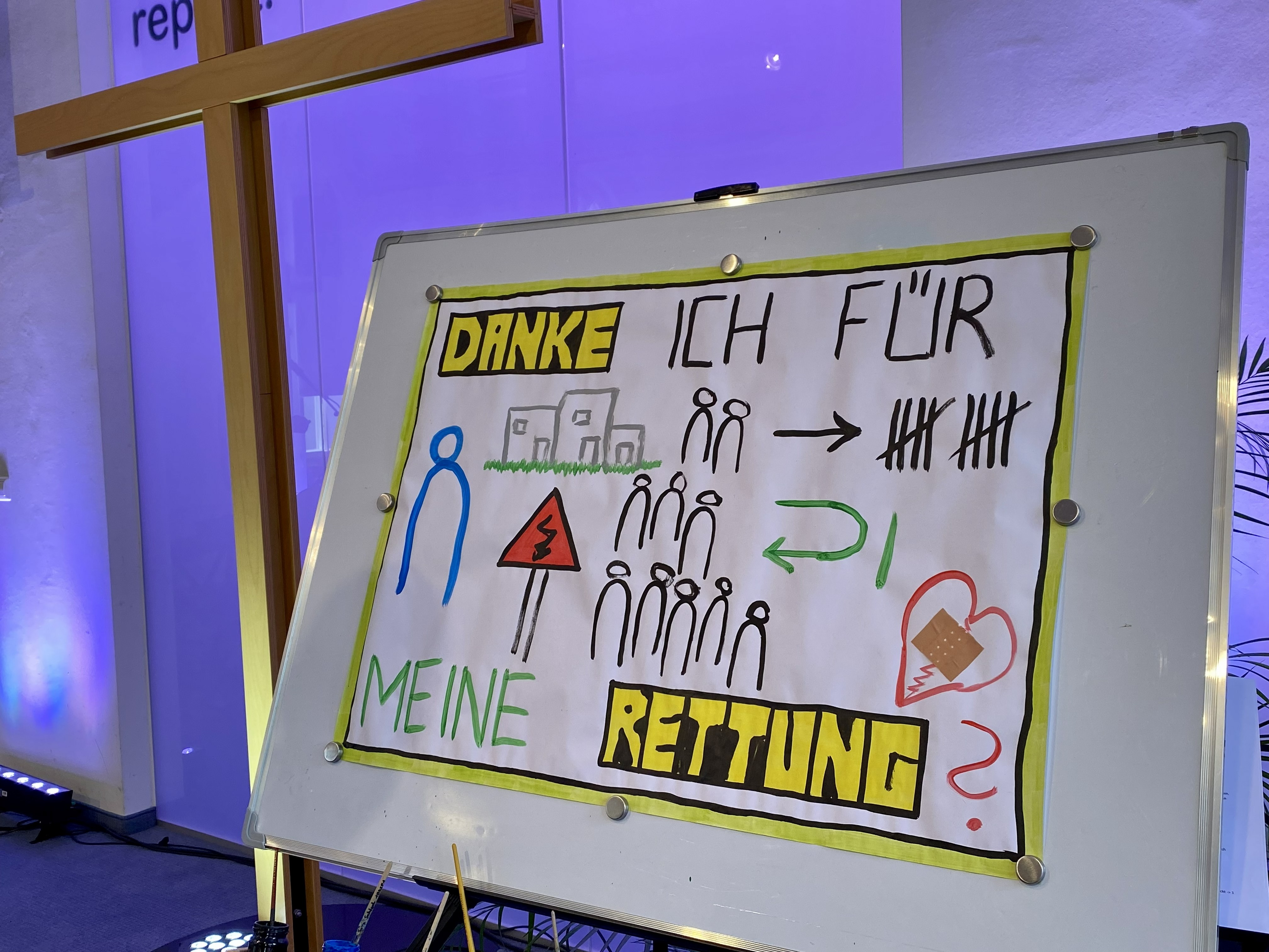„Danke ich für meine Rettung?“ steht zum Schluss am Sketchboard. Sara Schleeh lud ein, das ganz praktisch zu tun. Im Gebet mit Gott danke sagen. Für ganz vieles, das er mir schenkt.
